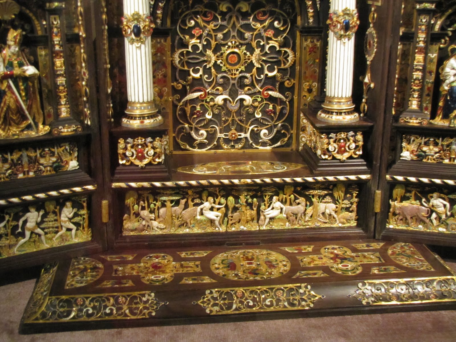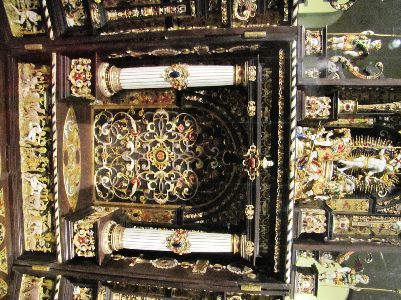 TRAVEL SET The most beautiful collection of treasures that I saw recently was at the Residenz (the home of the Wittelbach dynasty) in Munich- in the treasury. It looks more like a private collection of treasures in ten intimate, small rooms than a museum: Duke Albrecht V had made a provision in his will that the treasures collected by him will not be sold and this was the beginning of the Treasury. There are jewel encrusted crowns, , exquisite mobile altar pieces like folded books which provided people with a mass wherever they travelled, a compact travel kit that belonged to a French Princess, stone studded ivory crosses, ornate cups of ostrich eggs and, bejewelled daggers which make for a mesmerizing morning. I loved some of the pieces like a gold and enamel statue of St George slaying a dragon made of ruby and emeralds. OLIVE STONE BOAT BRONZE VESSEL WITH INSCRIPTIONS