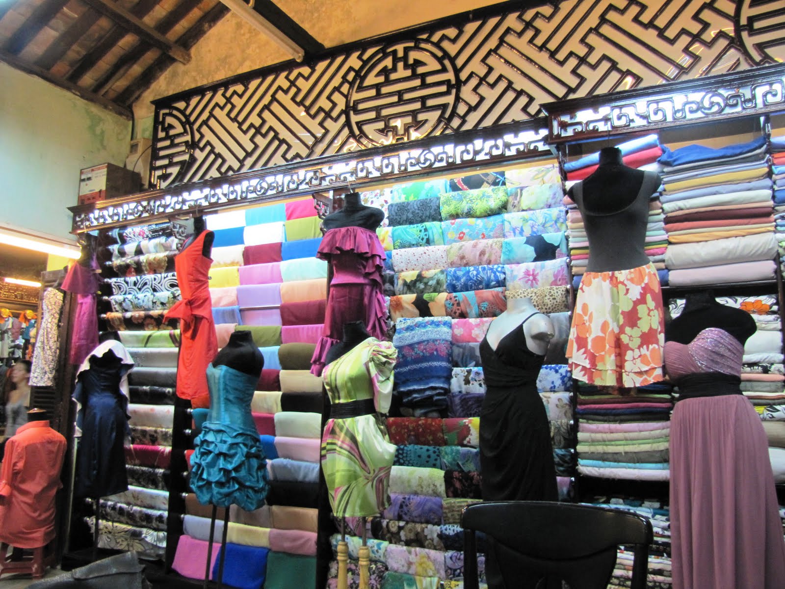 Well how do you go about getting a dress or a suit or winter jacket made? You can browse the catalogues or if you have done your homework and brought your own designs, they can copy that for you. Choose from the bolts of colourful silk, chiffon, knits and cotton stacked in the shops. Generally the cost of a dress varies between 20-30USD. You are measured and called for a fitting in about 2 hours. If the fitting is ok you get the dress immediately otherwise it’s sent back to the factory for adjustments. There are up-market shops like Yaley and A Dong Silk which are a bit expensive and other mid -range shops. We used a shop called Hugo II on Tran Phu street. My daughter had a dress made in chiffon- really good fit!