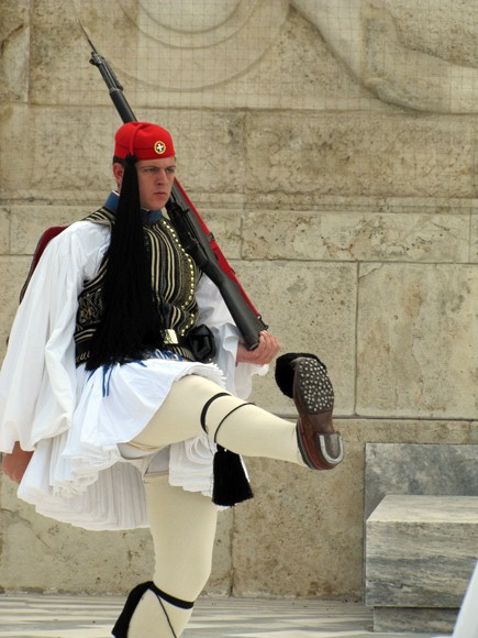 de resistance is the costumes that the Evzones wear: a kilt- like flounced skirt called the fustanella with 400 pleats (one for