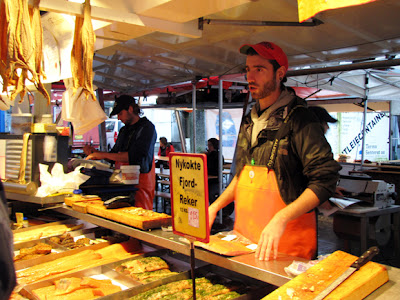 The waterfront was home to a raucous fish market , the Torget, filled with tightly packed tents with benches and stalls with fish mongers in bright orange suits vending pearly pink slivers of marinated salmon.